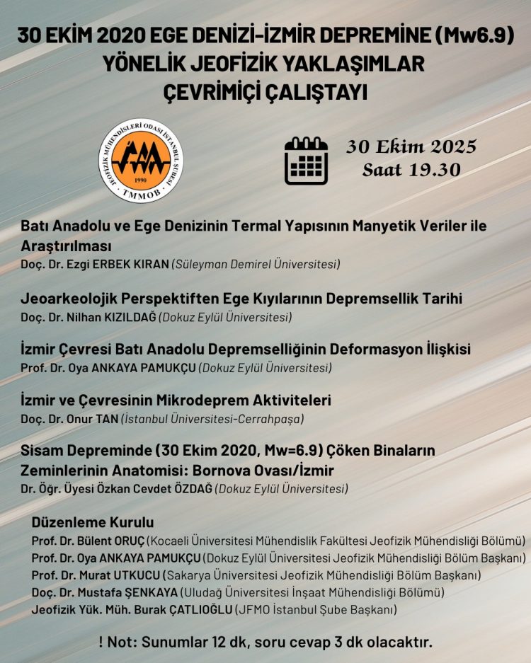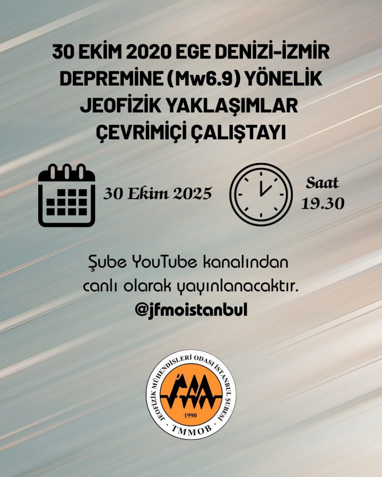 TMMOB Jeofizik Mühendisleri Odası (JFMO) İstanbul Şubesi, 30 Ekim 2020 tarihinde meydana gelen Ege Denizi-İzmir depreminin (Mw6.9) bilimsel boyutlarını ele almak amacıyla, 30 Ekim 2025 Perşembe günü saat 19.30‘da “30 Ekim 2020 Ege Denizi-İzmir Depremine (Mw6.9) Yönelik Jeofizik Yaklaşımlar” başlıklı çevrimiçi bir çalıştay düzenlemektedir.